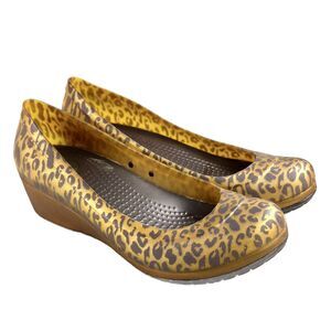 Crocs Shoe Womens Sz 8 Leopard Carlisa Slip On Closed Toe Mini Wedge