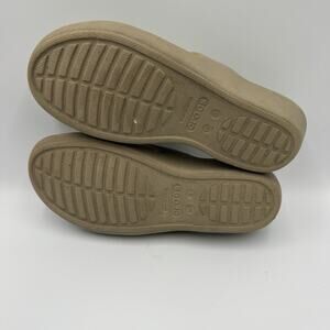 This product is a pair of Crocs women's sandals in size 8. They are brown/tan in color with a block heel and open toe design. These slip-on sandals are perfect for casual occasions and feature a solid pattern. Made of rubber, they offer comfort and convenience for everyday wear.