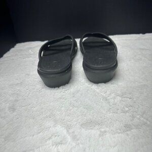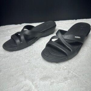 The product is a pair of Crocs slides in a woman's size 10. These sandals are designed specifically for women and feature a classic slide style with a black color and synthetic upper material. The Crocs brand is known for its comfortable and durable footwear, making these slides a convenient and stylish choice for everyday wear.