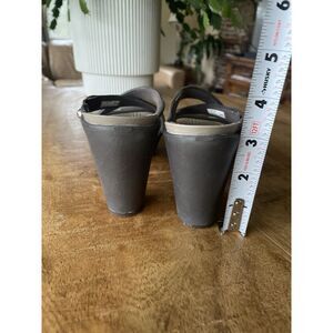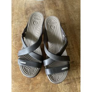 Women’s Crocs sandals, style 14558. Grey| Brown Croslite™ material with criss-cross straps and open toe design. Slip-on mule style with comfort footbed and approx. 3.5” block heel. Lightweight, durable, and easy to clean. Size W5 (US Women’s 5, EU 35-36). Preowned, gently used, in very good condition with minor signs of wear on soles.