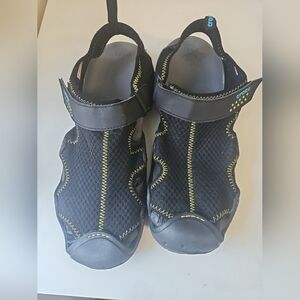 These CROCS water shoes are designed for outdoor adventures, featuring a durable synthetic build and a sturdy rubber sole. The black and yellow color scheme adds a vibrant touch, while the closed toe design ensures protection and comfort during water activities.