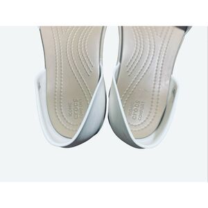 Open toe, flat silloutte and round toe shape, secure closed heel feels secure around foot, 3 bands across toe for secure and comfortable for, iconiccroc comfort and signature logo