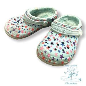 This is a listing for a very cute pair of child size 9 crocs in pretty good condition. The inside lining has some dirt and debris and has been matted down from play. The bottom soul of the shoes has tons of use left as you can see in photos. These sky blue crocs have purple pink red and blue stars covering.