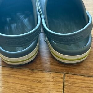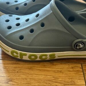 Crocs Unisex Bayaband Clog -Stylish gray slippers with green accents. Easy to slip on. Ideal for playtime.