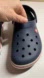 Hard to find Unisex Crocband Crocs clogs in Navy blue, with a white and red stripe. Comfortable and stylish. Great for everyday wear or beach, vacation, pool, water activities. Women’s size 11, Men’s size 9. Excellent preowned condition, worn only couple times for a beach trip.