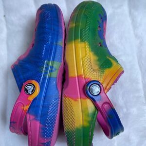 Crocs Unisex multi vibrant color clogs with hot pink faux fur lining size W7 M6 pre owned in good used condition normal wear see all pictures any questions please message.B10