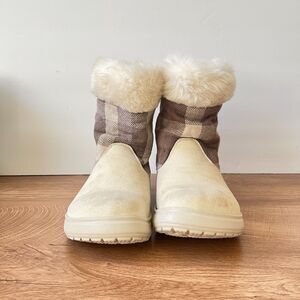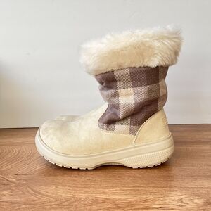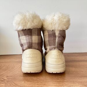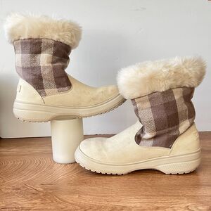 Crocs Winter Shearling Style Plaid Faux Fur Beige Boots Women's Size 7