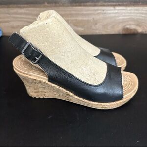 Crocs Womens A Leigh Leather Peep Toe Slingback Cork Wedge Sandals Black Size 6