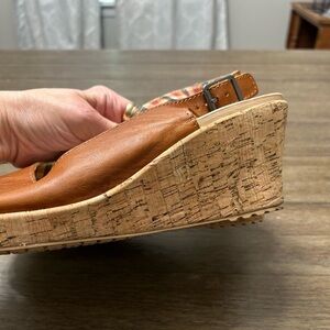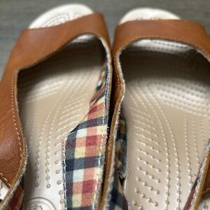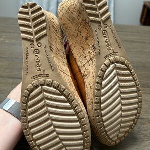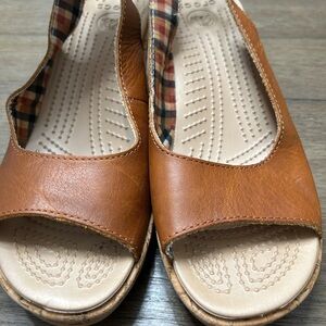 Crocs Women's A-Leigh Cork Heel Peep Toe Leather Slingback Tan Sandals Size 10
