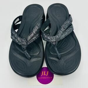 Crocs Women's Capri Strappy Black Shimmer Slip On Comfort Flip Flop Sandals 205478 Size 8