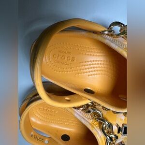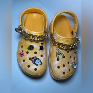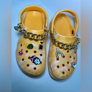 Vibrant yellow Crocs with fun charms. Comfortable and stylish for kids. Crocs Women's Classic Platform Graphic Clogs Orange Yellow White Sorbet Size 7