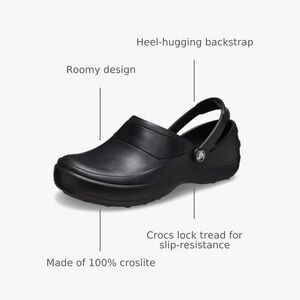 Made for on-the-job comfort. Roomy by design like the original Classic Clog, the Mercy Work Clog offers generous room all around the foot. It has Crocs Lock tread for slip-resistance, a heel-hugging backstrap, and a closed heel.