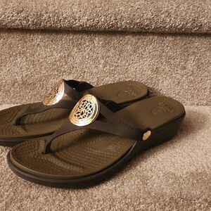 Crocs Women's "Sanrah" Taupe Brown-Gray Wedge Heel Sandals Size 10