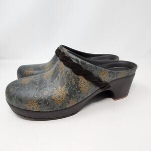 Crocs Crosslite women's Sarah floral graphic print slip on clogs mules, 2" block heel, closed round toe, dual comfort shoes, brown and green print with brown leather braided strap