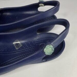 These classic Crocs slingback flats in navy blue are perfect for everyday wear. Lightweight and comfortable with a secure slingback strap and cushioned footbed. Features cut-out detailing at the toe and a slip-resistant sole. Gently worn with minimal signs of wear. Size Women’s 6.