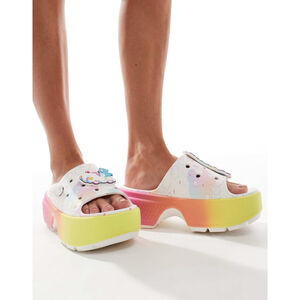 It’s cool to care so step into the stylish Care Bears Stomp Slide. This exclusive design features a rainbow gradient of color wrapping the exaggerated lug sole, while the upper is adorned with a printed stars and cloud design. Oversized Care Bears character Jibbitz pair with plush charms for an ultra-cute, personalized touch.