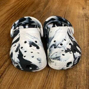 Eye-catching clogs with a black and white abstract marble design. Perfect for casual wear.