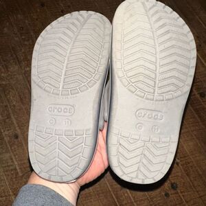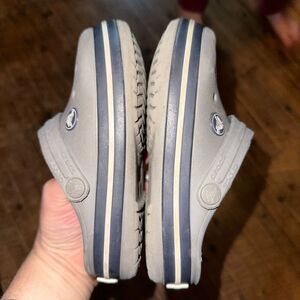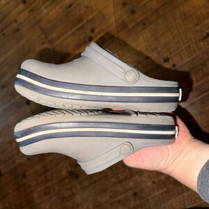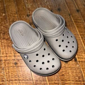 Crocs closed toe, gray with black stripes, comfortable ,vented, rubber, washable, comfortable shoes. Great for play and school. In good, used condition. From a pet and smoke free environment.