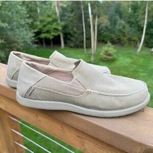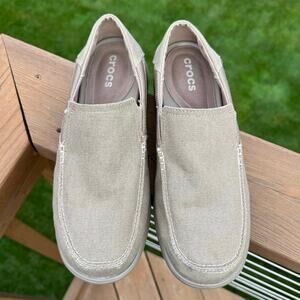 Crocs brand, Santa Cruz II style, canvas slip on comfort loafers, color described as beige, tan or khaki, men's size 12, excellent pre-owned condition