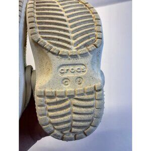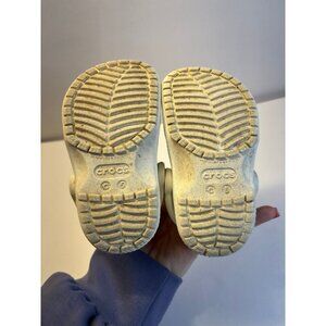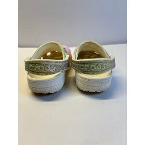 Crocs toddler size 5C rainbow color with cute little charms. These have been hand washed and air dried. However, they’re still signs of dirt or stains but overall great condition still has lots of life. Left good tread straps have a glitter on them.