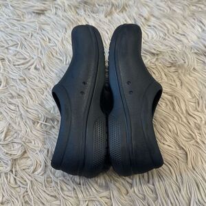 Excellent condition, black slip resistant crocs. Perfect for a work environment such as a restaurant. Very comfortable for standing up all day. Size 7 in men’s or 9 in women’s. Unisex style.