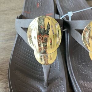 Stylish thong sandals with gold accents. Perfect for casual wear.