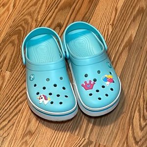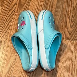 Crocs Light Teal Blue, white Stripe, Clogs, Sandals W 9