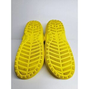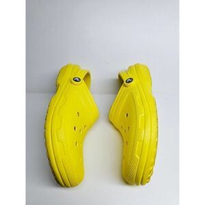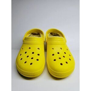 I am pleased to offer you a pair of Crocs in size 8, presented in a striking yellow hue. These winter slip-on shoes are in good condition overall, with the only notable aspect being the need for a minor interior cleaning, ensuring they maintain their fantastic appeal.