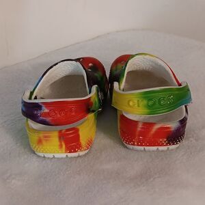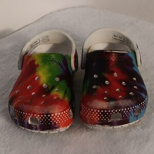 These unisex very colorful rainbow tie dyed classic Crocs are an infant size 4. All offers are welcome.