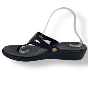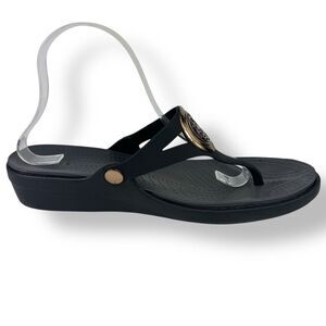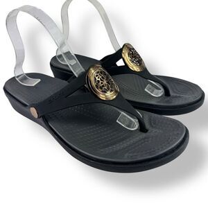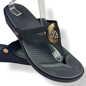 Crocs Sanrah Wedge Sandals Black Metallic Gold Circle Medallion Ring Womens 11