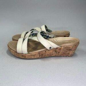 Crocs women's A-Leigh cream leather strap cork wedge sandals in excellent gently used condition!