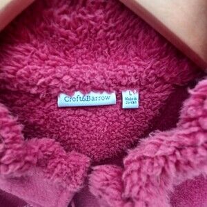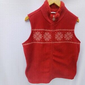 Croft And Barrow woman's large Holiday fleece Vest red with snowflakes This fleece vet has a zipper closure complete with snowflake emblem as the zipper pull. 100% polyester, machine washable make this very easy to wash, wear and care for. This is perfect for wearing to those holiday get togethers. Great for spirit days. Nice for if you are in a milder climate for the holiday season. Great to wear over a turtle neck. Pair it with jeans or khaki's for a casual look. Could also be paired with dress pants or skirt and nicer turtleneck for a dressier occasions such as holiday parties or just to wear to the office. There are two open slip front side pockets.
