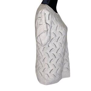 This Croft & Barrow beige crochet sweater in size M boasts a chic crew neck and short sleeves. Its ribbed texture combines 60% cotton and 40% acrylic for comfort and style.