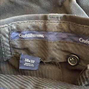 These Croft & Barrow black dress pants are crafted from a solid, structured fabric, offering a classic straight-leg silhouette. Ideal for formal occasions, they maintain a crisp and polished appearance. The full-length design ensures a sophisticated look suitable for business settings.