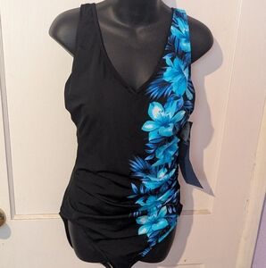 Elegant swimsuit with a striking blue pattern. Ideal for poolside relaxation.