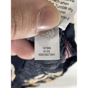 Pre-owned and gently worn. Fabric, seams, and print are clean and intact. Buttons and elastic cuffs are secure and functional.