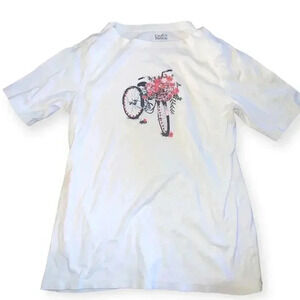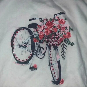 This top is very cute. It has a bicycle with red sequins around the tires on the front with a plain white back. The fabric is not thin and see through. The added plus to those of us that like our upper arms covered is that the sleeve has a 5" inseam, so they aren't short. This top would look very cute with jeans or leggings paired with a nice jacket or cardigan for the cooler months. Euc. Size large