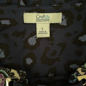 This beautiful Croft & Barrow tunic-style top in a women's size large features a deep navy blue base with a subtle leopard print throughout. The standout design element is the ornate medallion-style pattern that runs vertically down the center front in rich shades of turquoise, purple, and cream—adding an elegant, boho-inspired touch. It has a flattering keyhole neckline and three-quarter length sleeves, making it perfect to pair with leggings or slim-fit jeans for a comfortable yet stylish look. It is in excellent pre-owned condition, and measurements are included in the photos.