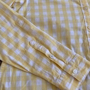 Trendy yellow and white gingham button down shirt. Perfect for casual outings. Soft and comfortable fabric with a fitted silhouette.