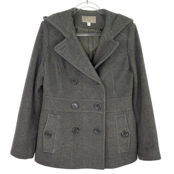 Croft & Barrow Charcoal Gray Wool Peacoat. Charcoal Dark Gray Double Breasted Peacoat with Buttons and Pockets. Fully, Lined, Classic Fitted Coat with Hood. Warm, Casual or Formal Winter Coat.