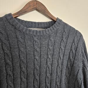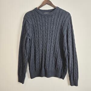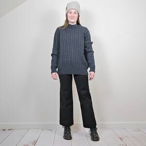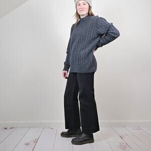 Charcoal dark gray cable knit chunky sweater with a crew neckline. Cotton and acrylic blend. Gender neutral - tagged a men's medium, fits the equivalent of a women's large per measurements. Could also work as an oversized look on smaller sizes.
