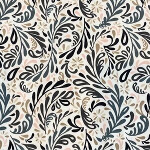 short sleeve top with a white pink black and ecru leaf scroll pattern.