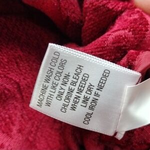 Croft & Barrow Women's Burgundy Deep Red Embroidered Tapestry Collared Long Sleeve Four Button Front Waist Length Dress Blazer Jacket. 56% Rayon, 44% Polyester. Two Front Open Side Pockets. Functional Two Button Cuffs. Top Button Hole With No Button. Measurements approx. Flat Lay. Pit to Pit: 23.5, Sleeves: 25, Length: 24. Size XL. Color May Vary Due To Lighting.