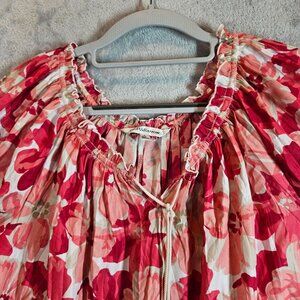 Croft & Barrow Floral Red Pink Peasant Blouse drawstring Womens L Feminine