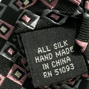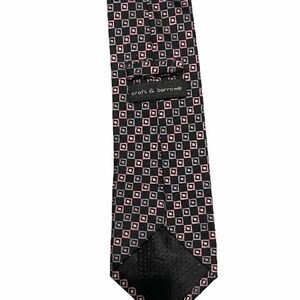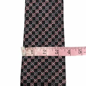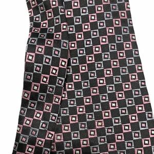 Features: black tie, pink and gray accents, geometric square pattern throughout