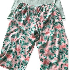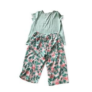 Comfortable pajama set with a green top and pink floral pants. Soft fabric. Relaxed fit.