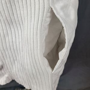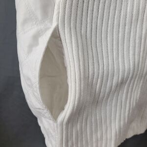 Ivory colored full zipper front quilted sweater jacket with two open side pockets and a collar style that fluctuates depending on the zipper position!