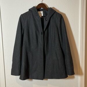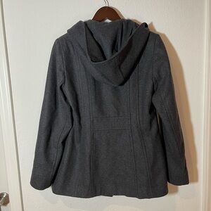 Classic wool and polyester button up jacket with hood in a super neutral dark grey. Lined and hits around hip length. The perfect fit that never goes out of style.