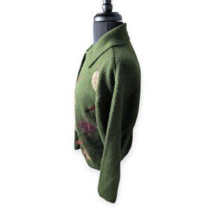 Charming green cardigan with leaf patterns. Button-up front design.
