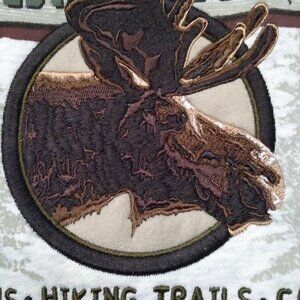 The moose is a stitched patch and the words Cabins Hiking Trails Canoes are stitched